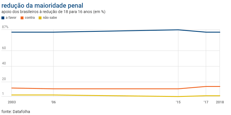 O percentual de brasileiros que acha que a maioridade penal deveria ser reduzida para 16 anos em todos os crimes também atingiu seu pico em 2015, quando 74% dos entrevistados pelo Datafolha disseram pensar dessa maneira. Após cair em 2017, o valor voltou a crescer em 2018: