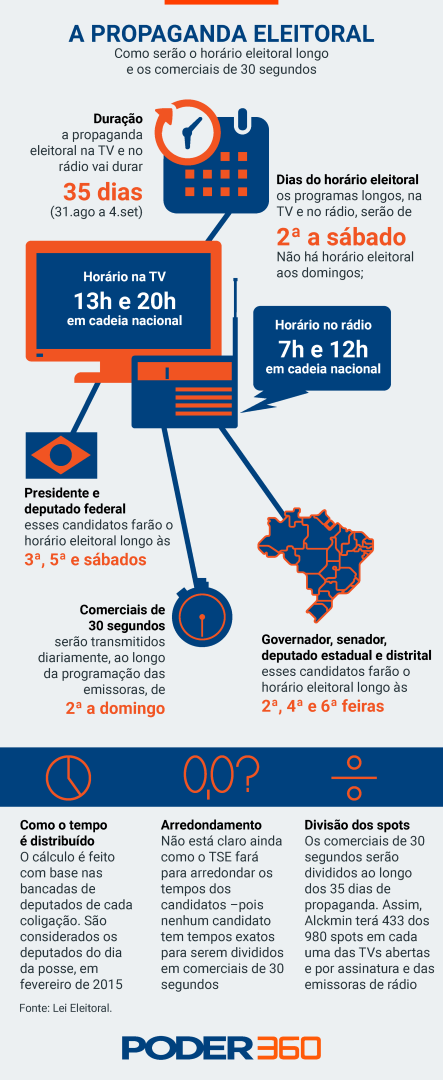 Os postulantes ao Planalto divulgarão seus planos de governo duas vezes ao dia, em blocos de 12min30s. Eles ainda têm direito a 28 inserções diárias de 30 segundos durante toda a campanha, divididos de acordo com as coligações e a representatividade no Congresso dos partidos a que se aliaram.
