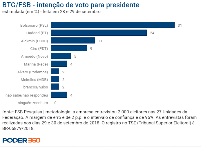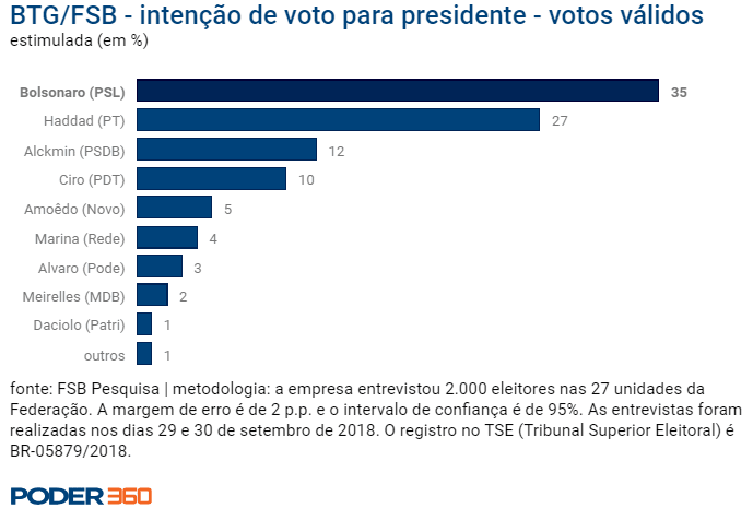 Levantamento encomendado pelo banco BTG Pactual à FSB Pesquisa mostra que Jair Bolsonaro, candidato ao Planalto do PSL, tem 35% dos votos válidos. Fernando Haddad (PT) aparece com 27%. Os votos válidos são aqueles dados apenas aos candidatos – sem considerar os brancos e os nulos.