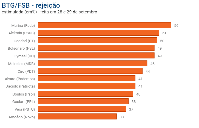 A candidata mais rejeitada é Marina Silva (Rede), que vem em trajetória de queda nas intenções de voto. Na pesquisa BTG/FSB, 56% dos entrevistados disse que não votaria na ex-ministra de jeito nenhum. Entre os principais candidatos, Ciro Gomes (PDT) é o menos rejeitado (44%).