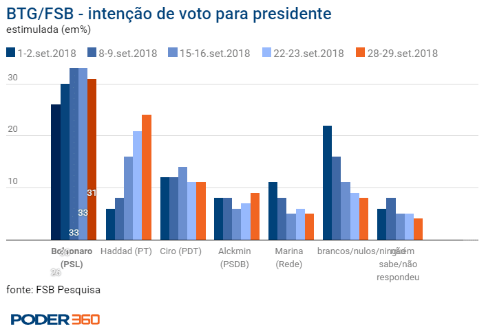 Jair Bolsonaro é líder com 31% das intenções de voto. Em 2º lugar está Fernando Haddad com 24%. Ambos oscilaram dentro da margem de erro em relação a última pesquisa, divulgada em 24 de setembro.