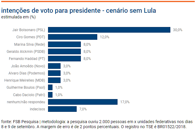 A 1ª pesquisa realizada inteiramente após o atentado sofrido na última 5ª feira (6.set.2018) pelo candidato do PSL a presidente, Jair Bolsonaro, indica que ele chegou a 30% das intenções de voto. O levantamento foi realizado pela FSB Pesquisa, que foi contratada pelo banco de investimentos BTG Pactual.