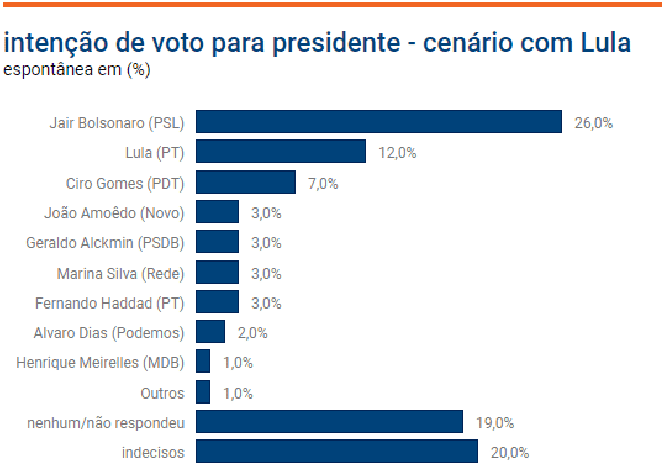 Quando o presidente Lula é cotado para o cargo no cenário espontâneo, ele aparece com 12% das intenções de voto. Neste cenário, Jair Bolsonaro (PSL) continua liderando com 26%.