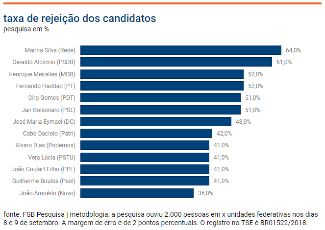Ao serem questionados sobre os candidatos que não votariam de jeito nenhum, os entrevistados apontam Marina Silva como a mais rejeitada, com 64%. Em seguida, Alckmin aparece com 61%.
