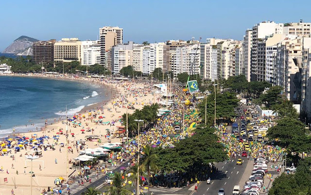 No Rio, os manifestantes começaram a se reunir por volta das 10h na orla da praia de Copacabana, na altura do Posto 5, na Zona Sul da capital fluminense. A todo instante os grupos gritavam palavras de ordem em defesa de Moro, além de palavras de apoio à Operação Lava Jato e ao ministro da Economia, Paulo Guedes, e à Reforma da Previdência. Eles chegaram a ocupar quatro quarteirões — cerca de 400 metros — da Avenida Atlântica.
