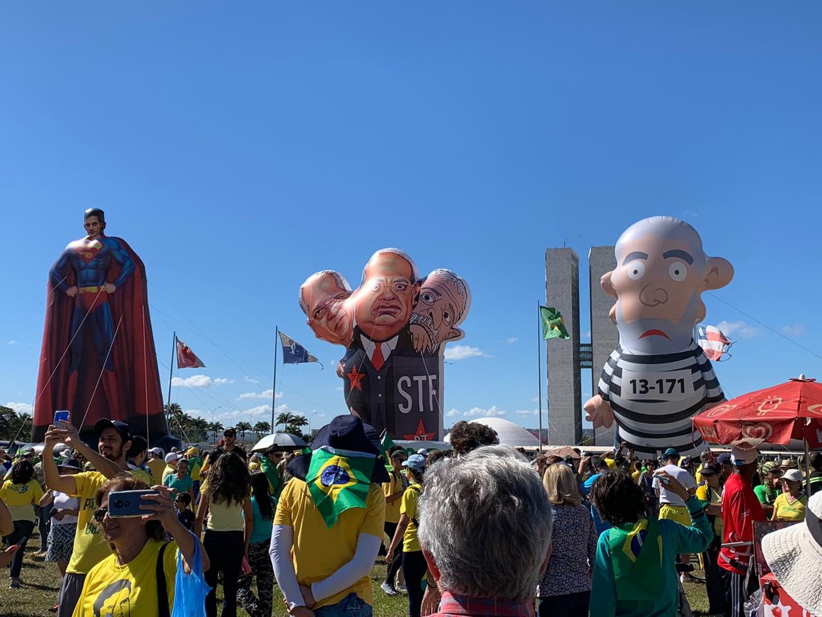 Em Brasília, por voltas das 10h, manifestantes ergueram bonecos infláveis no gramado em frente ao Congresso Nacional. Um dos personagens, segundo os organizadores, representa o ministro Moro vestido com roupas do "super-homem". Também há representações do ex-presidente Lula e de ministros do Supremo Tribunal Federal (STF).