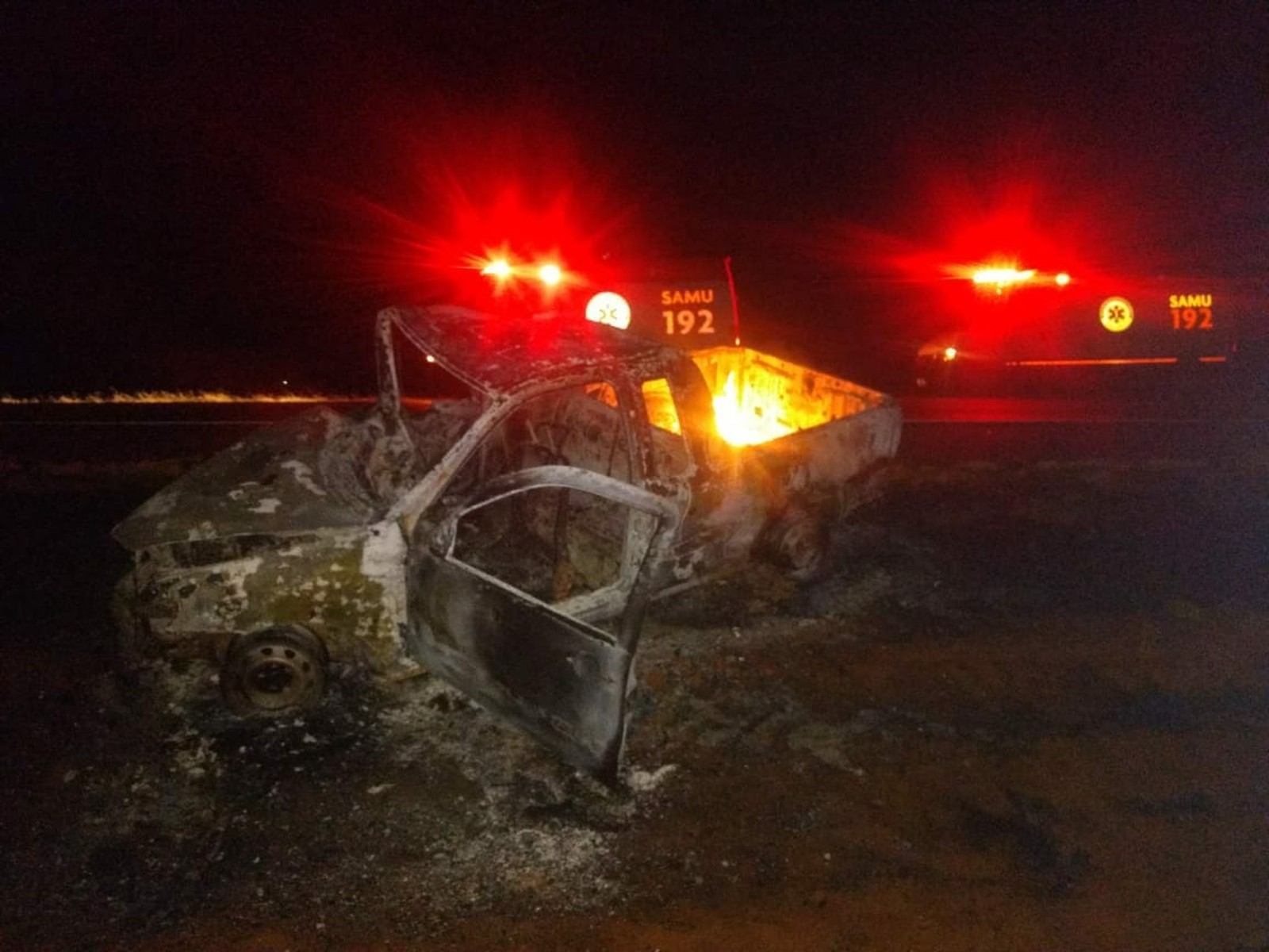 Uma caminhonete pegou fogo após bater em outro veículo na BR-020, trecho da cidade de Correntina, no oeste da Bahia. O veículo ficou completamente destruído.