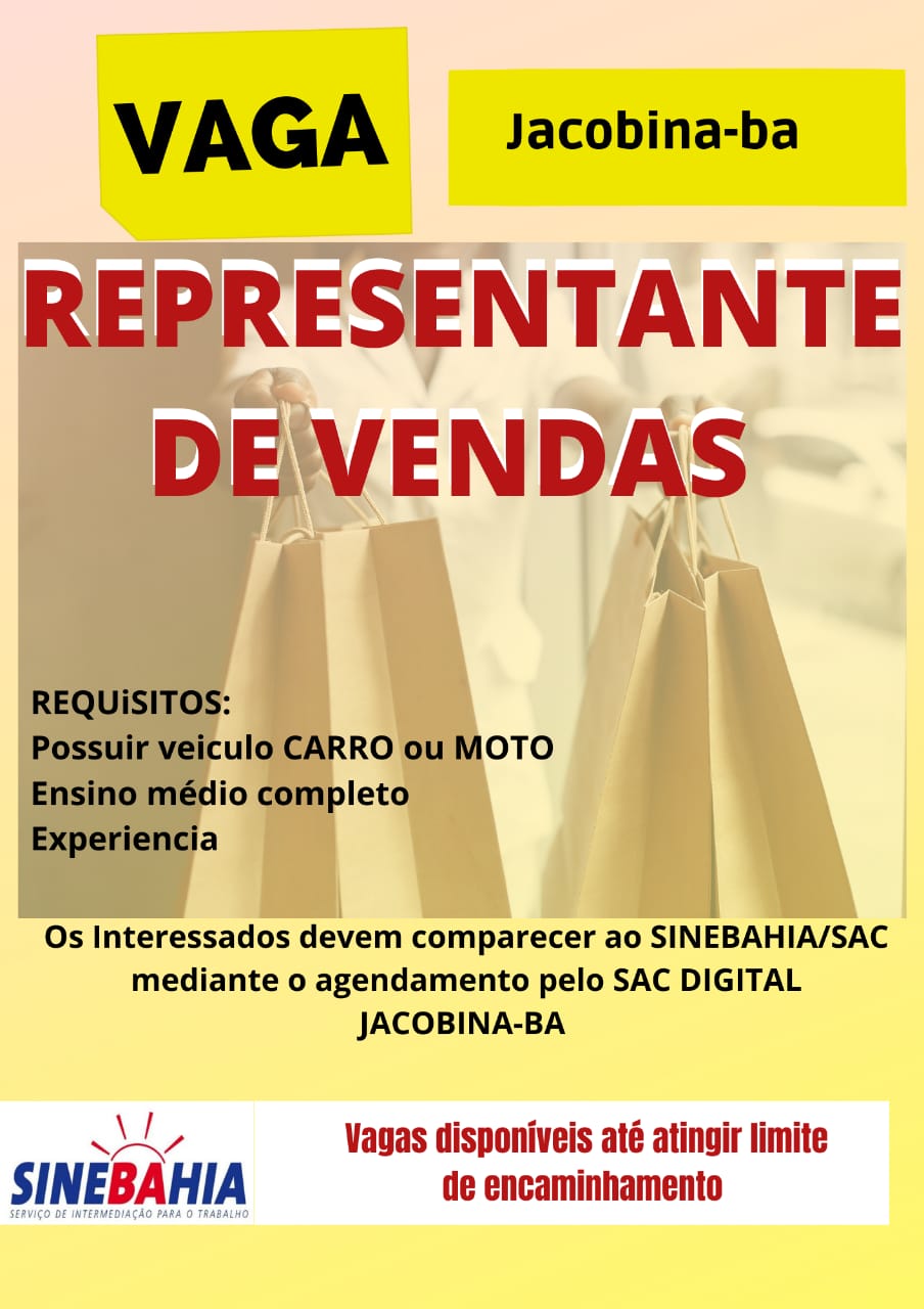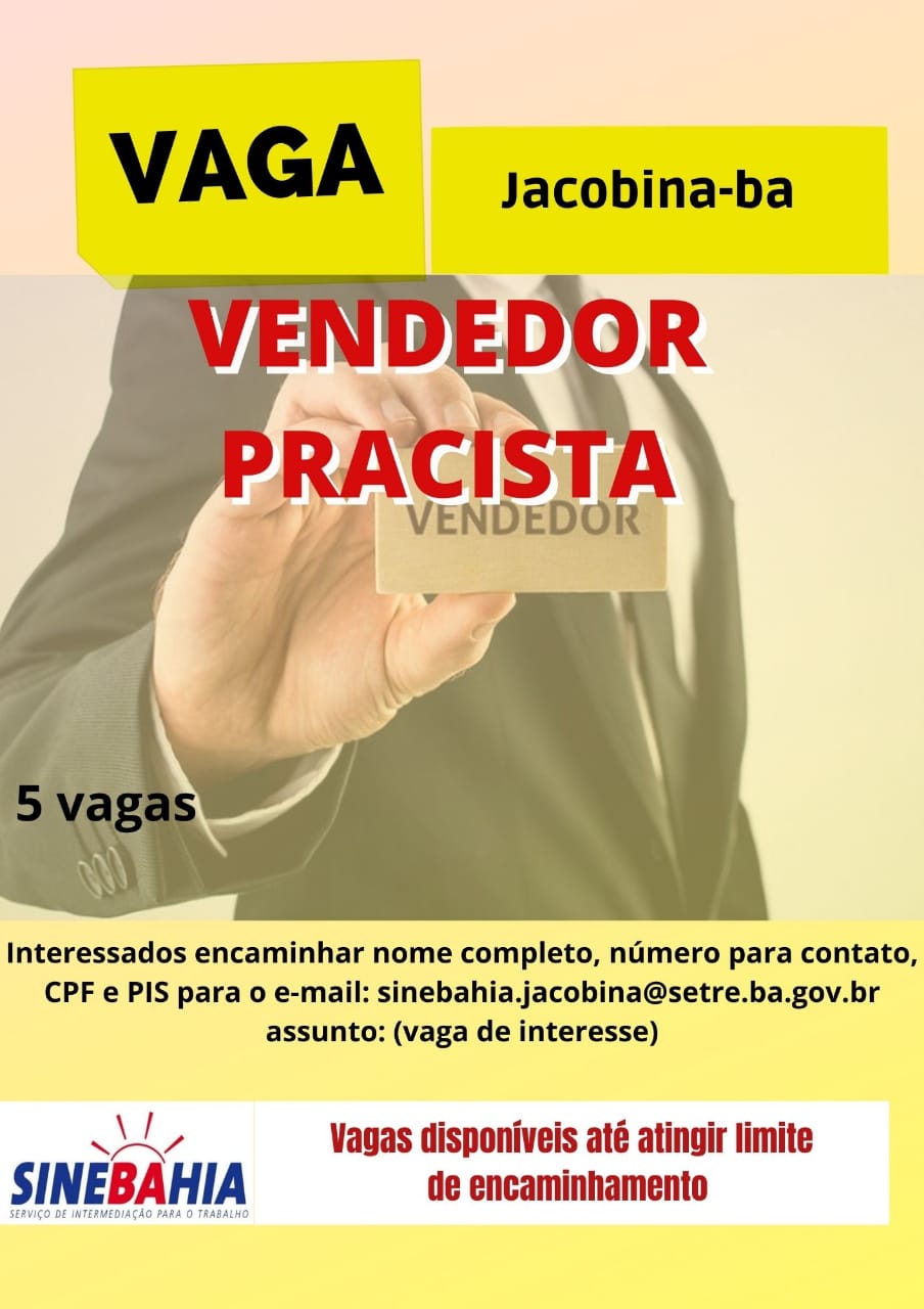 O Jacobina Notícias, em parceria com o SineBahia, estará informando as vagas de emprego e áreas de atuação disponíveis para a cidade. Vale destacar que, é importante a participação dos empregadores em geral junto ao SineBahia, para que essa intermediação possa ser desenvolvida.