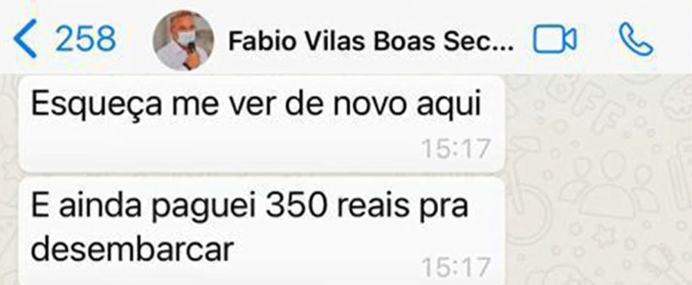 "Esqueça de me ver de novo aqui. E ainda paguei R$ 350 para desembarcar. "Amigo o caralho! Vagabunda", escreveu ele.