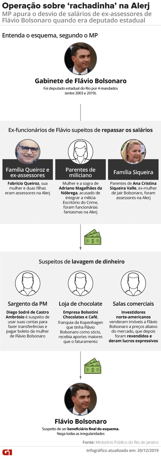 Os promotores dizem que Fabrício Queiroz “arrecadou grande parte da remuneração de funcionários fantasmas do então deputado estadual Flávio Bolsonaro” e que foram identificados pelo menos 13 assessores que repassavam parte do salário. Queiroz recebeu 483 depósitos na conta bancária, mais de R$ 2 milhões.