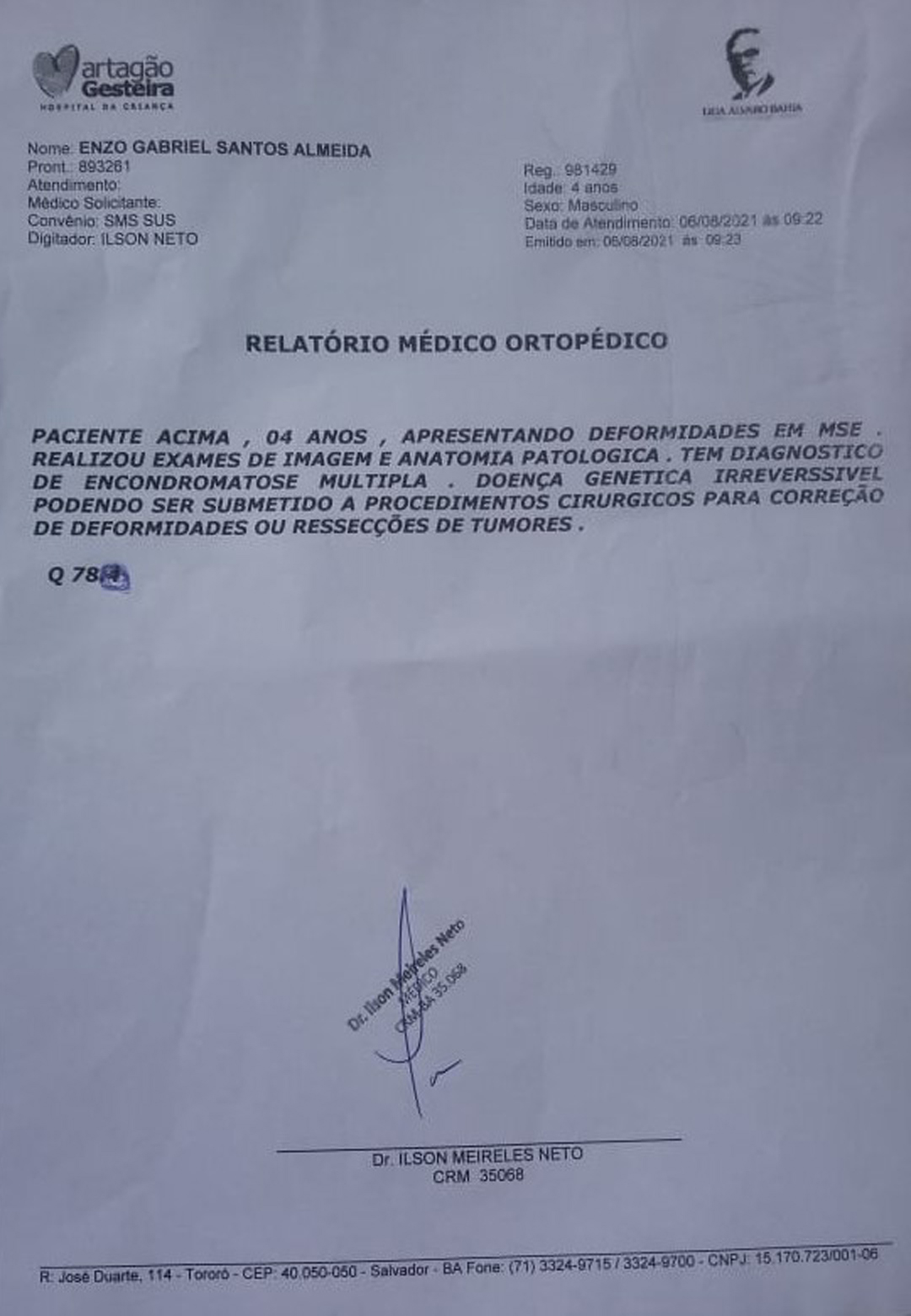 Qualquer pessoa que possa ajudar o pequeno Enzo e sua família, inclusive com doação de móveis, pode entrar em contato com seus pais através do telefone (74) 9.9939-9736 ou (74) 9.9928-0155. Chave do PIX CPF 099.299.425-05 (Genevaldo Santana Nascimento)