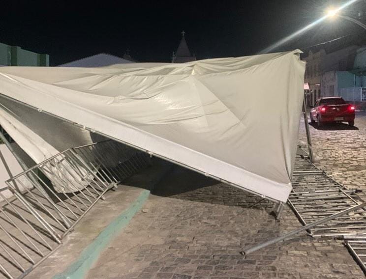 Um vendaval derrubou os toldos e demais equipamentos usados no drive-thru da vacinação contra a Covid-19, na noite desta quarta-feira (22), ao lado da unidade de saúde do bairro Matriz, em Jacobina. Um leitor do Jacobina Notícias registrou o incidente e disse ter ficado preocupado, já que muitas pessoas devem buscar a vacinação pela manhã.