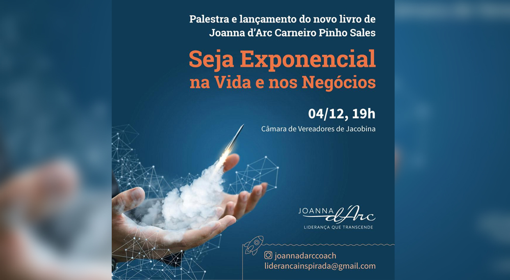 O impacto do avanço tecnológico nas relações interpessoais e de trabalho, no ritmo de vida cada vez mais acelerado e no crescimento rápido de empresas e negócios tem caracterizado uma tendência mundial conceituada como exponencial, algo que cresce de forma extraordinária e progressiva. É dentro desse contexto que a terapeuta organizacional Joanna d’ Arc, lança seu mais novo livro, “Seja Exponencial na vida e nos negócios” com o intuito de despertar o leitor para essas transformações e buscar todo seu potencial nas diversas áreas da vida e nos negócios. O livro será lançado dia 4 de dezembro , às 19h, na Câmara