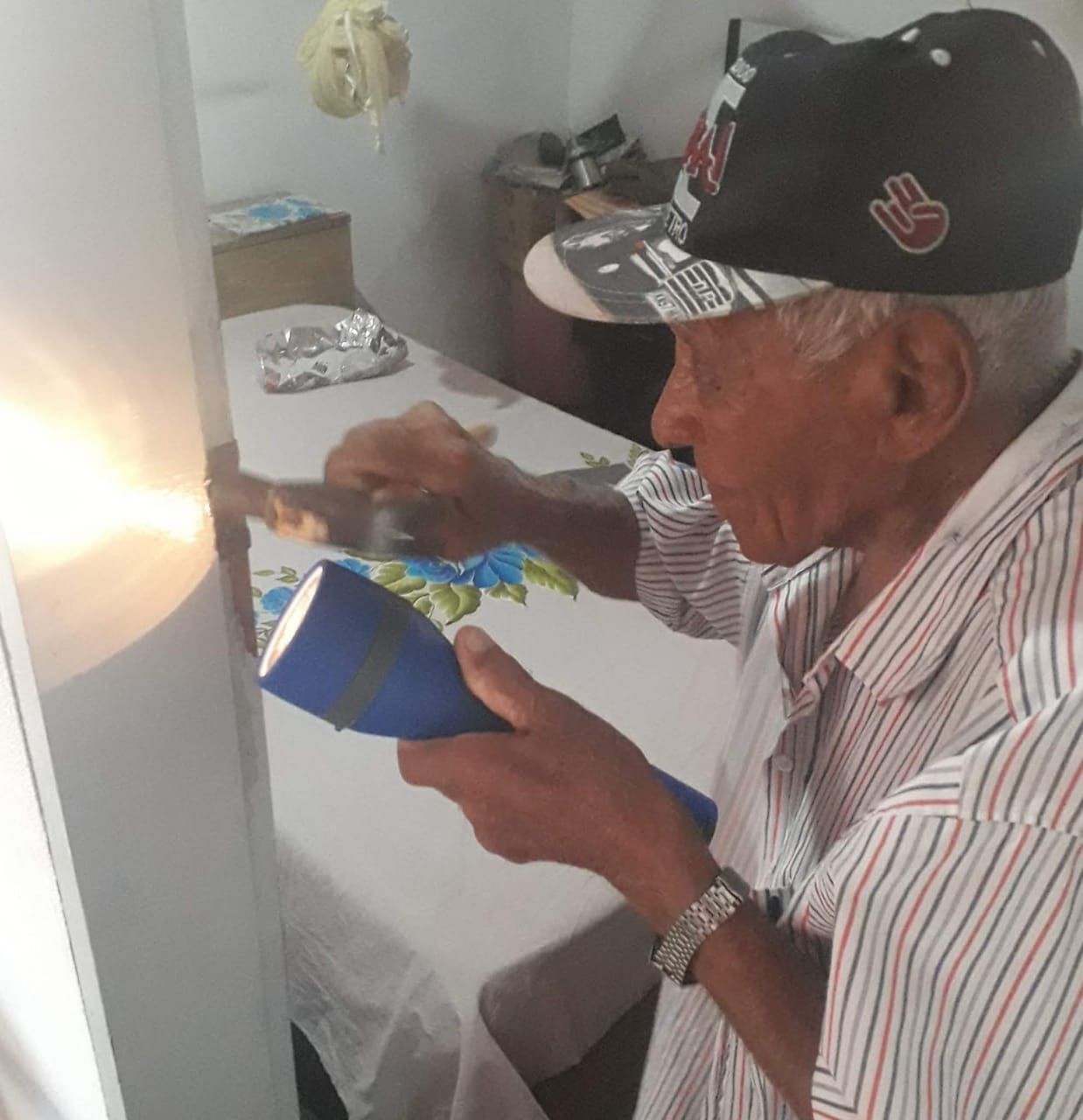 Na tarde desta sexta (7), a reportagem do Blog do Ril de Beto, esteve na casa de Seu Irineu. Ao chegar na residência, ele foi flagrado com um martelo em uma mão e uma lanterna na outra, consertando a fechadura da porta do quarto, demonstrando assim toda sua vitalidade. Sempre ativo e atencioso, Seu Irineu falou de seus costumes e manias. Comer pouco, dormir bem e viver sempre com alegria. Quando fala sobre a morte, ele diz que ela está arrudiando, porém ele não deixa ela entrar em sua residência. "Aqui não entra morte nem mosquito", disse o centenário.