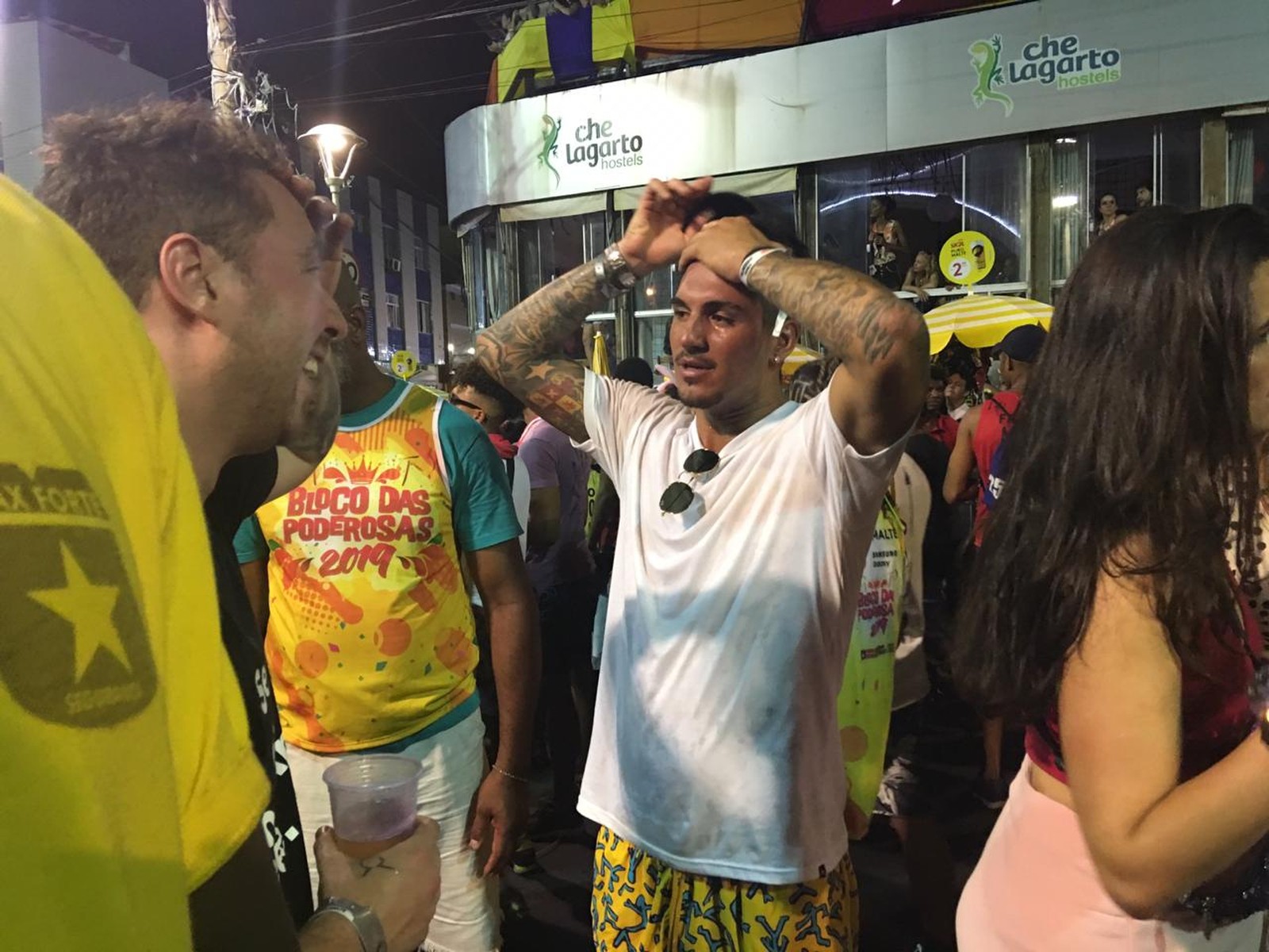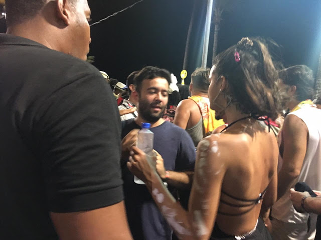 Vestida de preto, com um super decote, Marquezine mostrou disposição em meio aos foliões, no chão. A atriz ainda usou no corpo a tradicional pintura timbaleira. Medina curtiu a festa também bem à vontade, de camisa branca e bermuda amarela estampada.