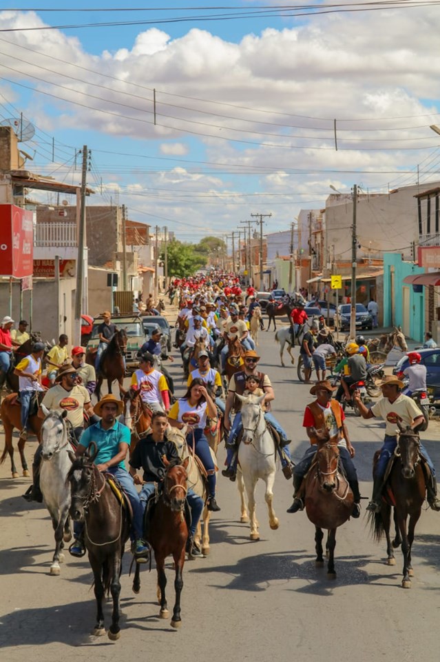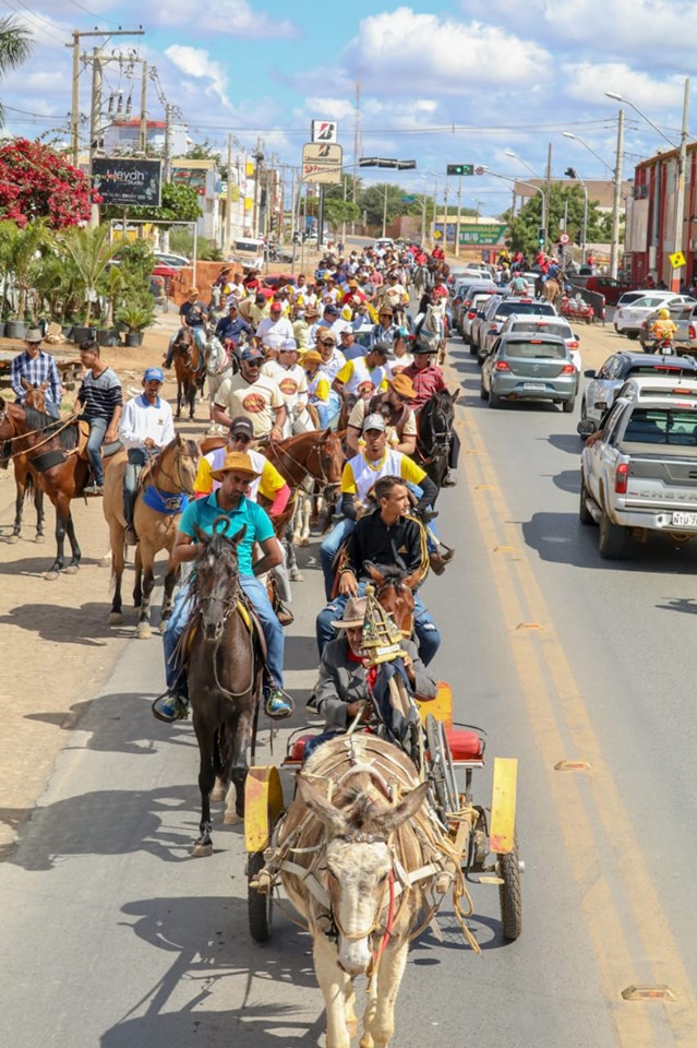 Abençoando os participantes, o Padre Chiquinho celebrou a missa na Praça Marcionílio Rosa, no bairro Boa Vista, de onde saiu a cavalgada pelas ruas da cidade, com grande participação, até o Parque de Vaquejada Auta Rosa.