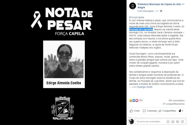 A prefeitura de Capela do Alto Alegre decretou, na terça-feira (9), três dias de luto. Na última quarta-feira (10), Reginaldo Gomes de Souza, conhecido como Regi Gordo, de 53 anos, também morreu após uma hemorragia interna.