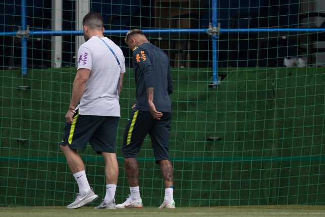 Preocupação total na seleção brasileira. Neymar deixou o treino desta terça-feira (19) com dores no tornozelo direito. O camisa 10 participou do aquecimento em roda de bobo ao lado dos companheiros, mas abandonou a atividade 10 minutos depois ao levar uma bolada no local. O camisa 10 foi atendido pelo fisioterapeuta Bruno Mazziotti.