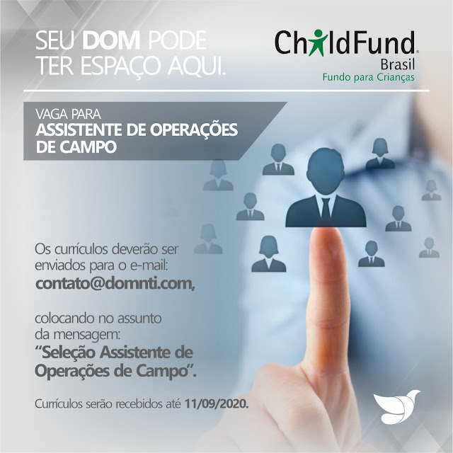 O Núcleo de Terapias Integradas - DOM, com sede em Jacobina, e o ChildFund Brasil – Fundo para Crianças, estão recrutando você, que deseja transformar o mundo com seu DOM. Procuramos por Assistente de Operações de Campo.