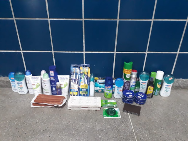 O veículo foi acompanhado e interceptado na cidade de Jacobina, nas proximidades do INSS, onde o motorista, um indivíduo de 49 anos, e o adolescente, de 14 anos, foram abordados. Com eles foram encontrados os materiais furtados da loja: 02 caixas de barbeador, 40 caixinhas de lâminas de barbear, 06 vasos de protetor solar, 11 potes creme facial, 02 pacotes de escovas, 05 desodorantes, 02 repelentes, 02 pacotes de linguiça, 03 espumas de barbear, 01 óleo de cabelo, 01 hidratante e 01 par de sandálias havaianas.