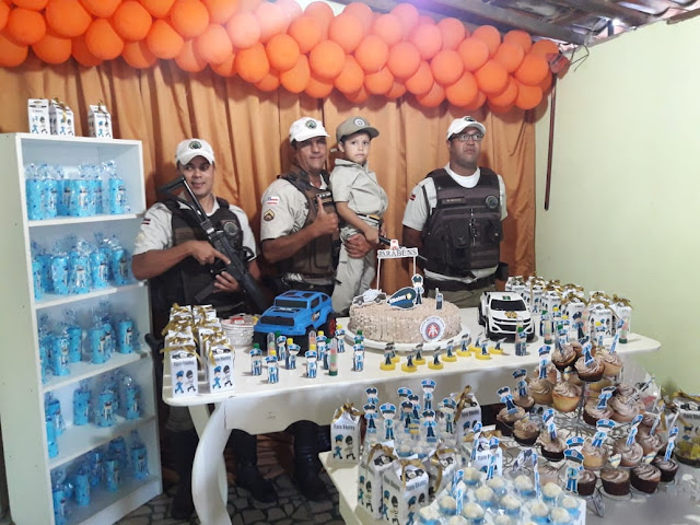 O pequeno Flávio Rikelme, morador do bairro Jacobina III, escolheu como tema para sua festa de 4 anos a Polícia Militar da Bahia (PMBA). Os policias se deslocaram para o evento e fizeram a alegria da criança, familiares e amigos presentes nesse dia especial. Por fim, se reuniram para registrar o momento ao lado do garotinho Flávio Rikelme.