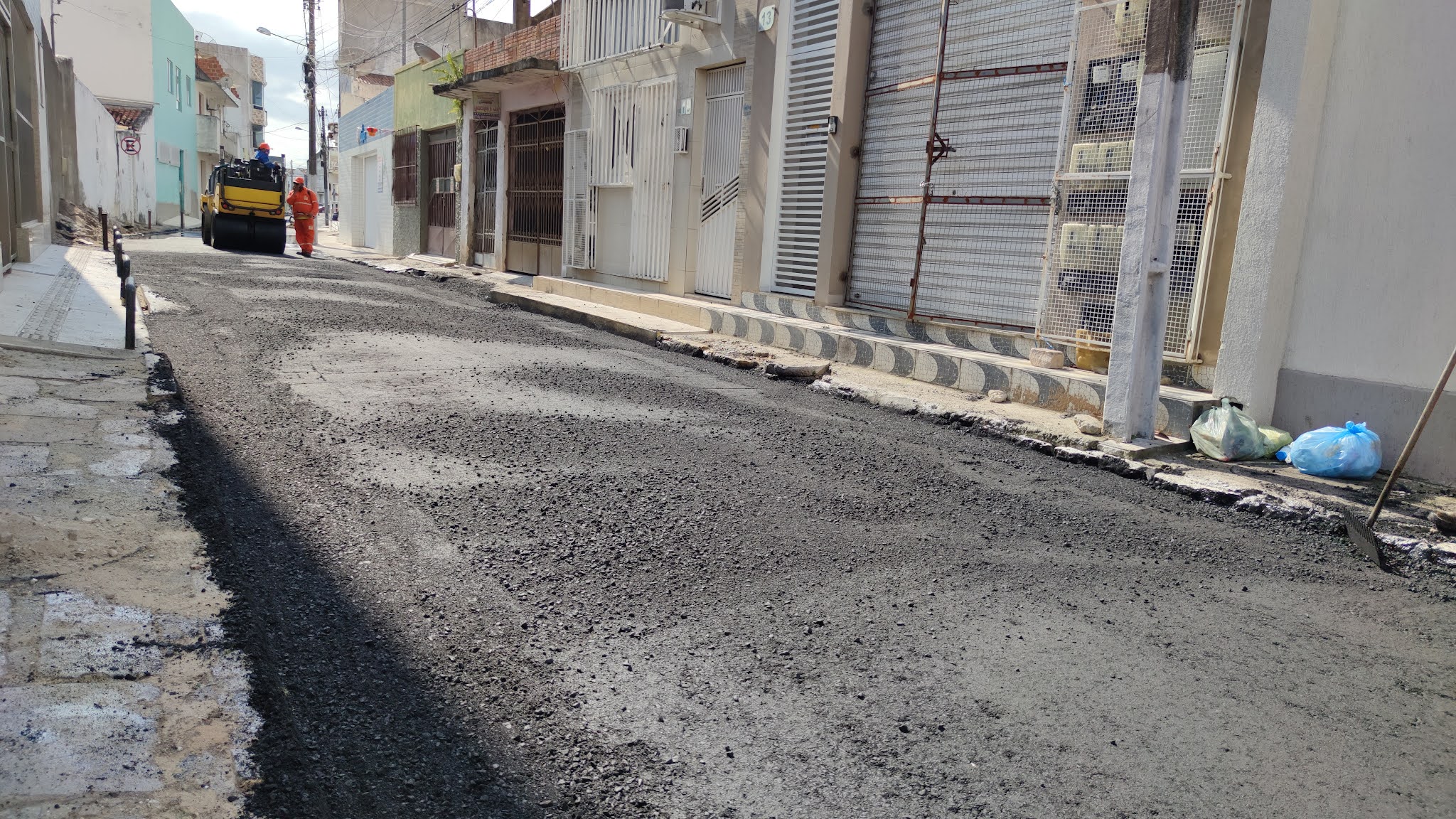 Homens e máquinas trabalham na tarde de sábado (25) no centro de Jacobina, na aplicação de camada asfáltica na Rua Antônio Pires e Ferreira, popularmente chamada de Rua da União.