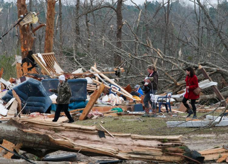 Pelo menos uma dúzia de tornados atingiu o Alabama e a Geórgia na tarde de ontem, segundo o Serviço Nacional de Meteorologia. Os fortes ventos, de até 240 km/h, destruíram telhados, imóveis e arrancaram árvores.