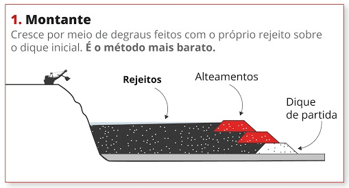 Barragem a montante - são construídas reaproveitando os rejeitos para sua própria sustentação, de camada a camada, até o limite máximo. Esse modelo de barragem (foto 01) foi utilizado em Mariana e Brumadinho, e não possui a segurança adequada. As chances de rompimento em barragens a montante, conforme explicou Jedlaf, são muito maiores do que com o modelo de construção utilizado pela Yamana Gold em Jacobina.
